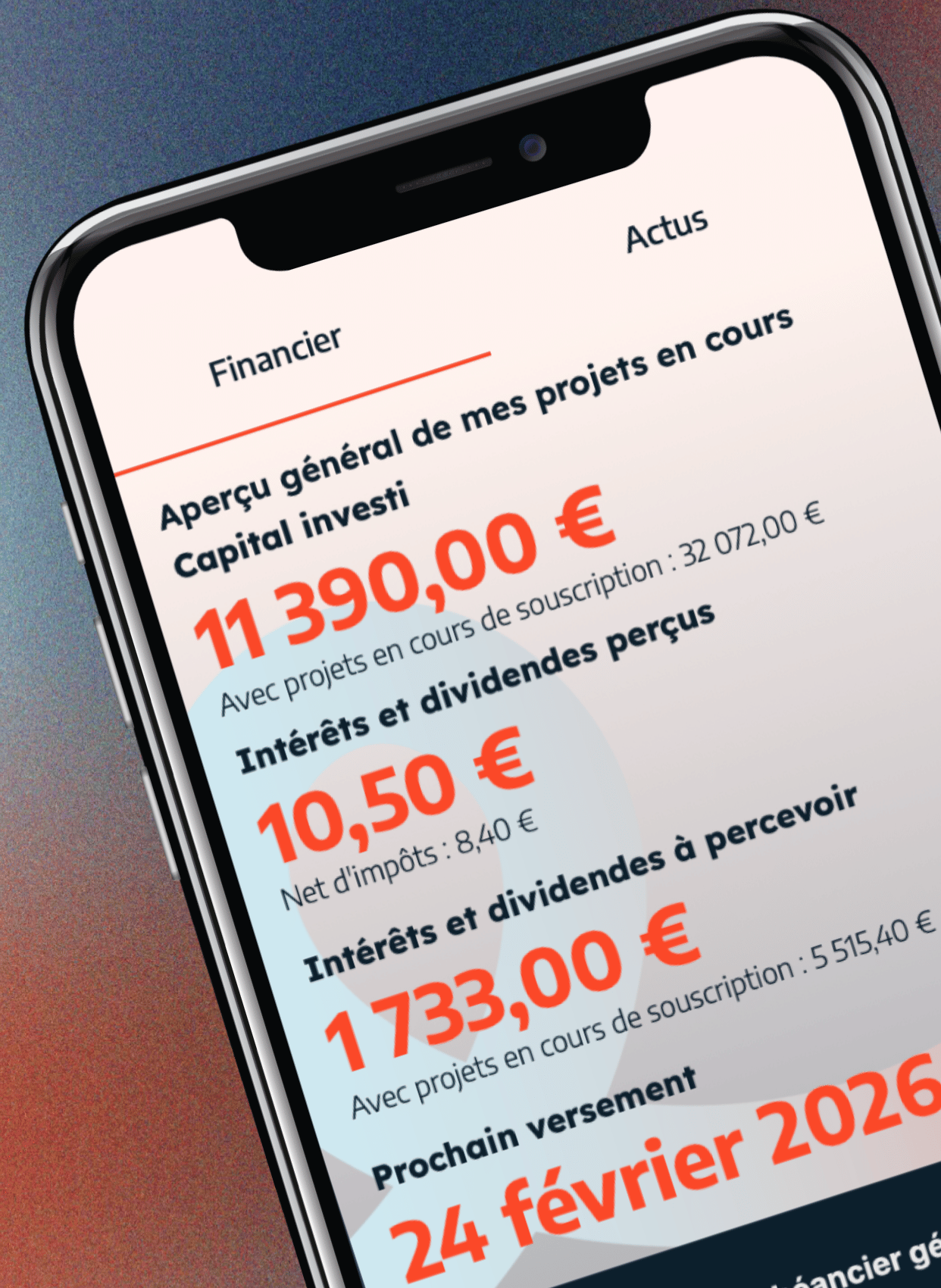 Flolend vous permet de souscrire à des projets, de suivre leur avancement et leurs actus, et de piloter la performance de votre portefeuille, sur le support de votre choix : iOS, Android, web.